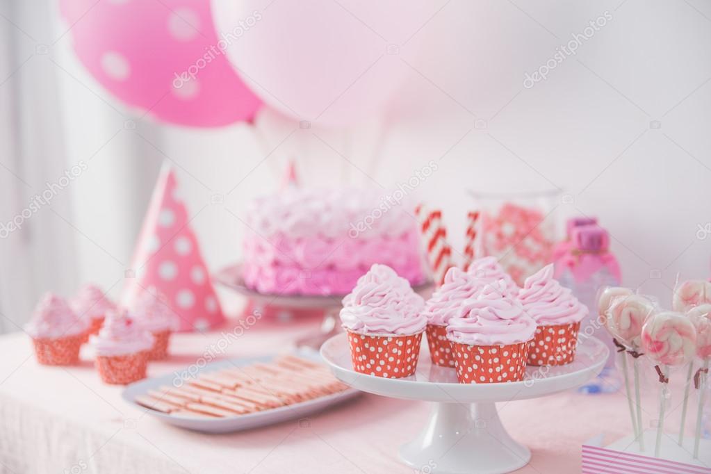 Portrait Of Birthday Party Supplies Sweet Corner With Cake