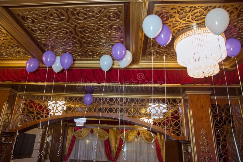 White Red And Purple Balloons Floating On The Ceiling Stock Photo