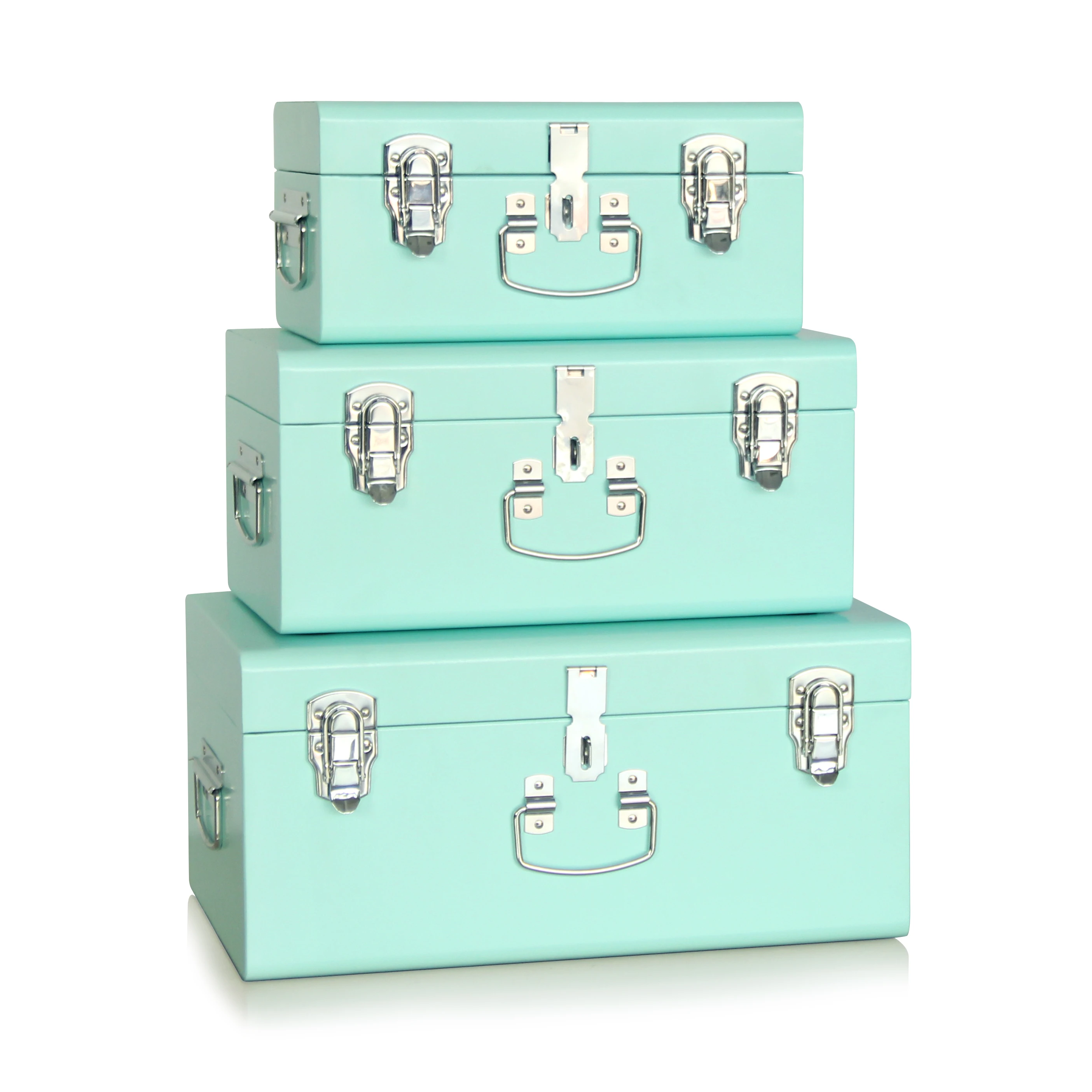 Set Of 3 Metal Storage Box Trunks With Silver Handles For Kids