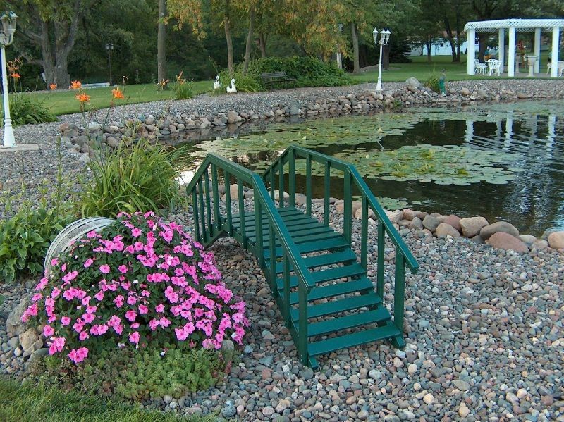 1 out of 5 stars 1. This zig zagging garden bridge design carries visitors over a lengthy pond and across several small grassy island planting beds.