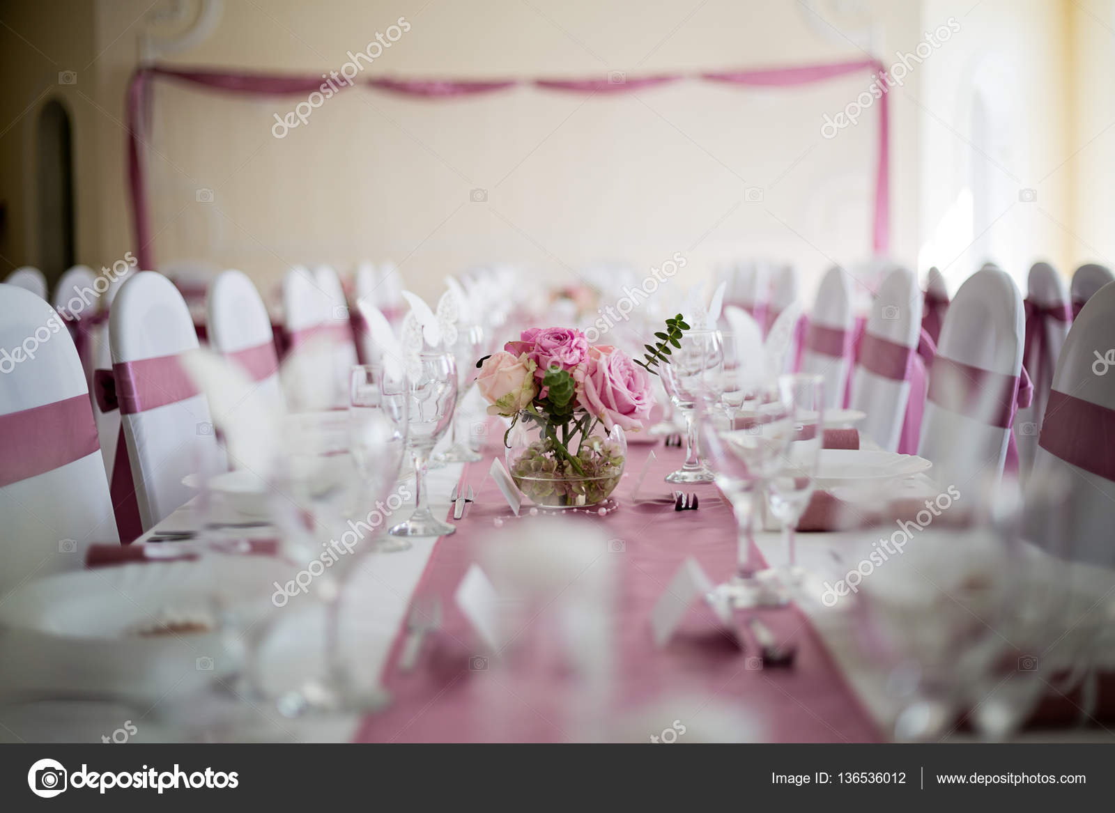 Winter Themed Wedding Table Decoration In Pink Lighting Stock