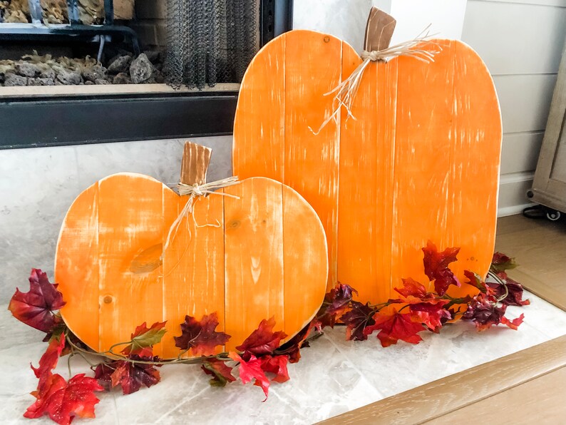 Wooden pumpkin decor. Set of three rustic wooden pumpkins painted pumpkin orange and distressed faces are hand drawn on one side only. Reversible face side for halloween no face side for fall adorned with natural raffia bows and assorted fall leaves in. Between 20 and 24.