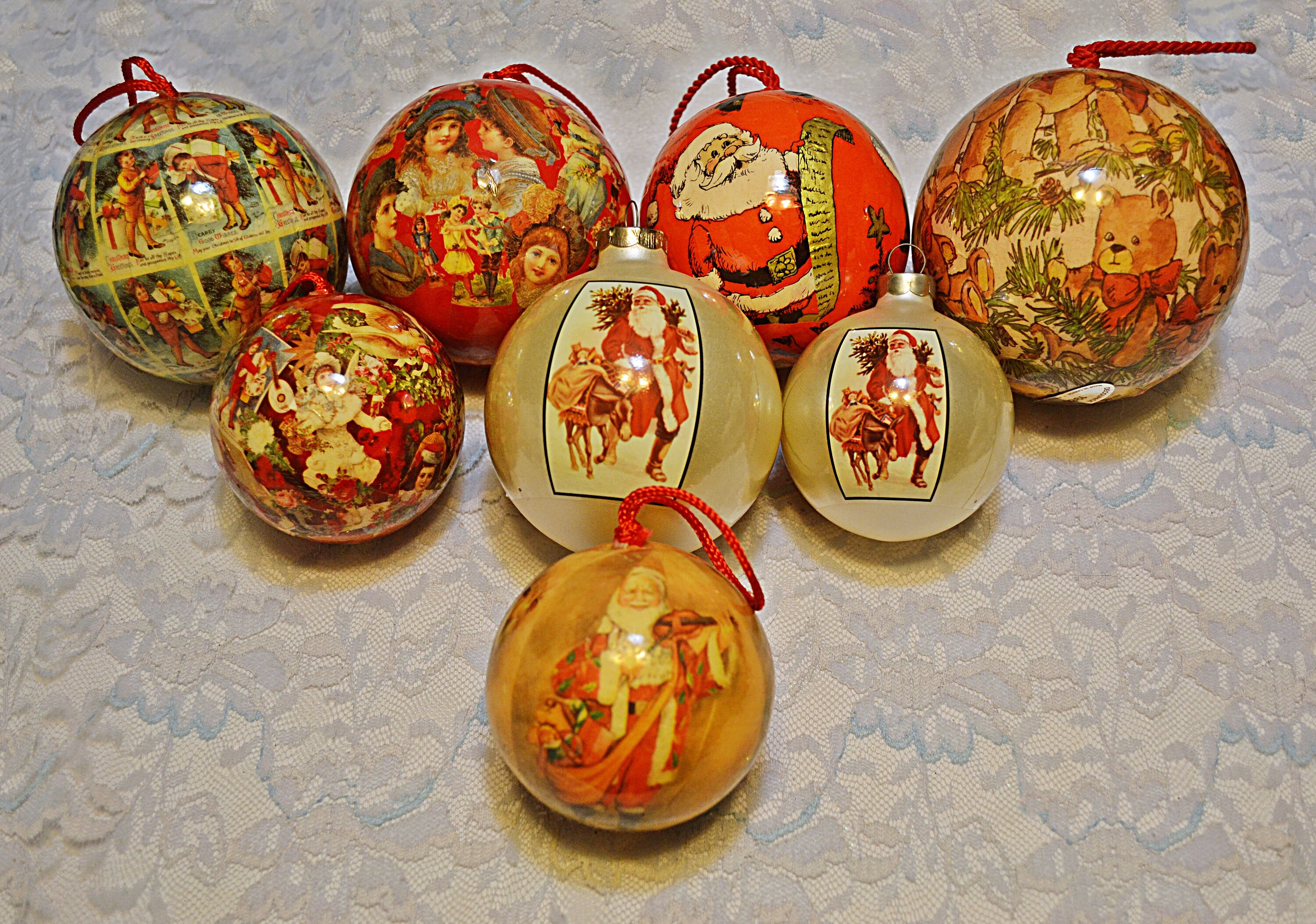 Collection Of 8 Vintage Christmas Balls Decoupage Ornaments