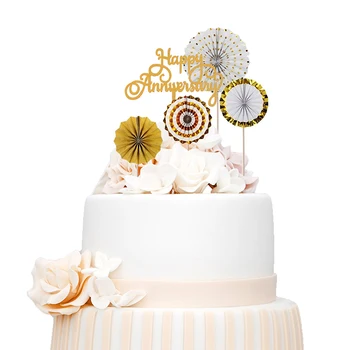 Happy Wedding Anniversary Acrylic Cake Toppers Gold Paper Fans