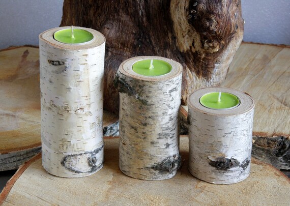 Set Of 3 Rustic Wooden Branch Log Tea Light Silver White Birch Etsy