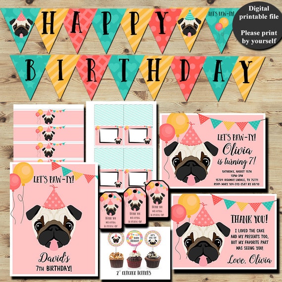 Pug Birthday Party Supplies Birthday Happy Birthday Etsy