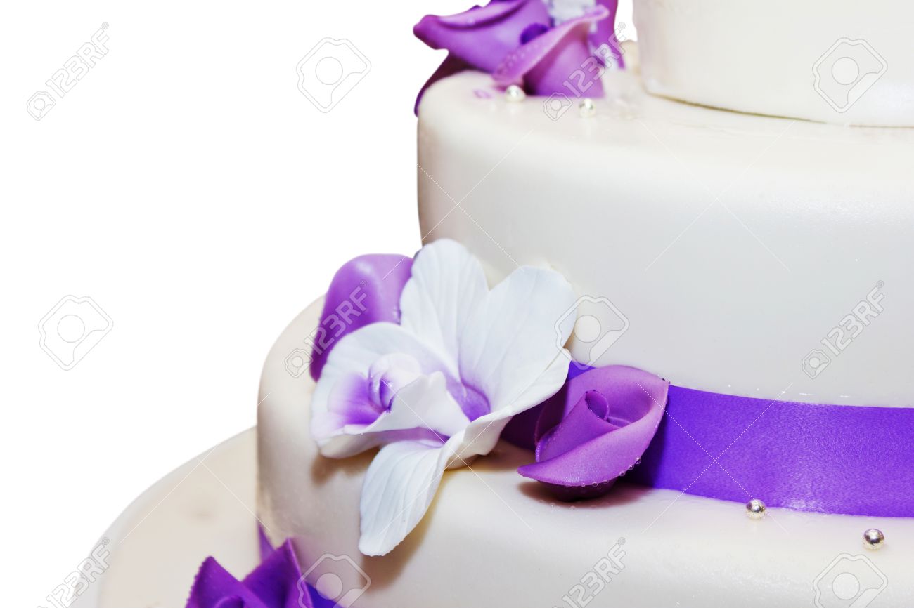 Tall Wedding Cake With Purple Ribbon And Flower Decorations Stock