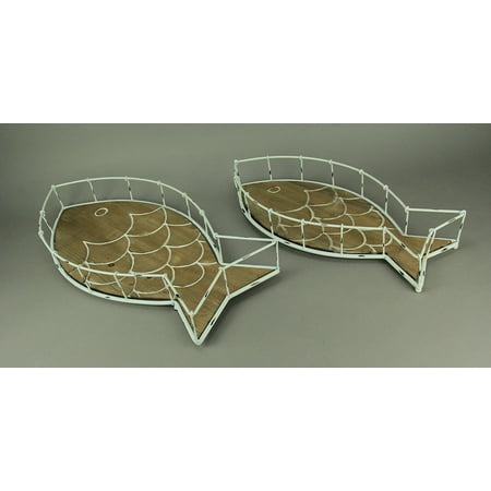 Beachwashed White Metal And Wood Fish Decorative Tray Set Of 2