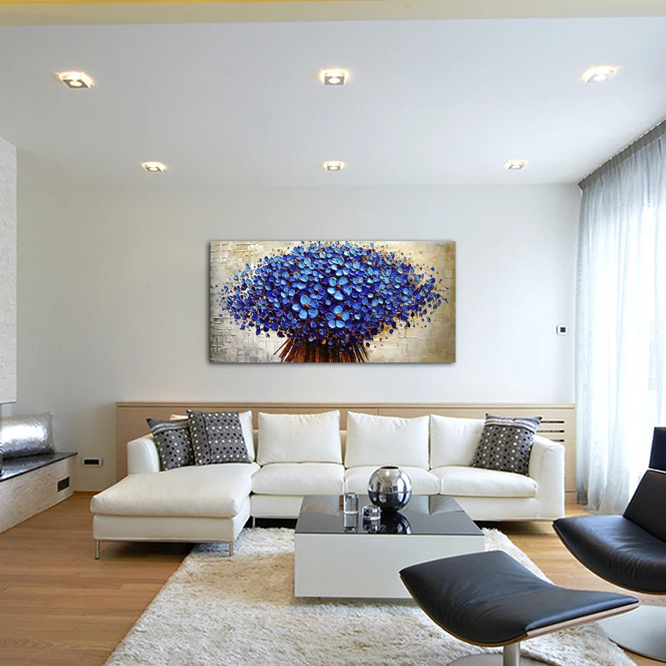 Unframed Panel Dark Blue Flower Tree Thick Palette Knife Painting
