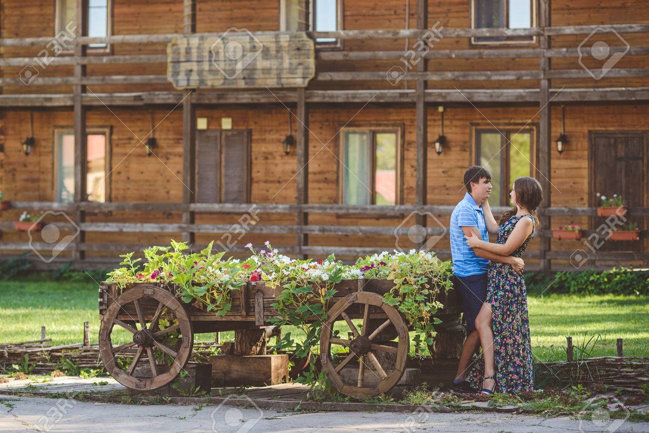 Romantic Young Couple Hugging Each Other Near A Decorative Wooden