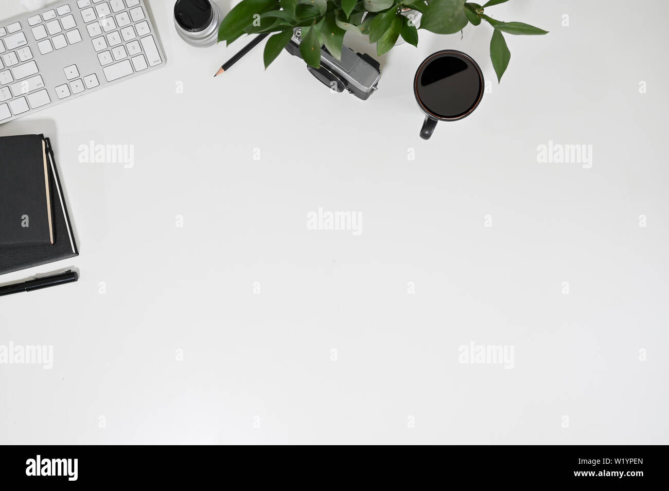 Workspace Top View Computer Keyboard Coffee Notebook With Plant