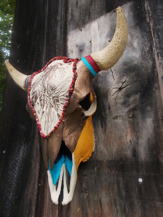 Native American Inspired Embellished Cheyenne Painted Bison Skull